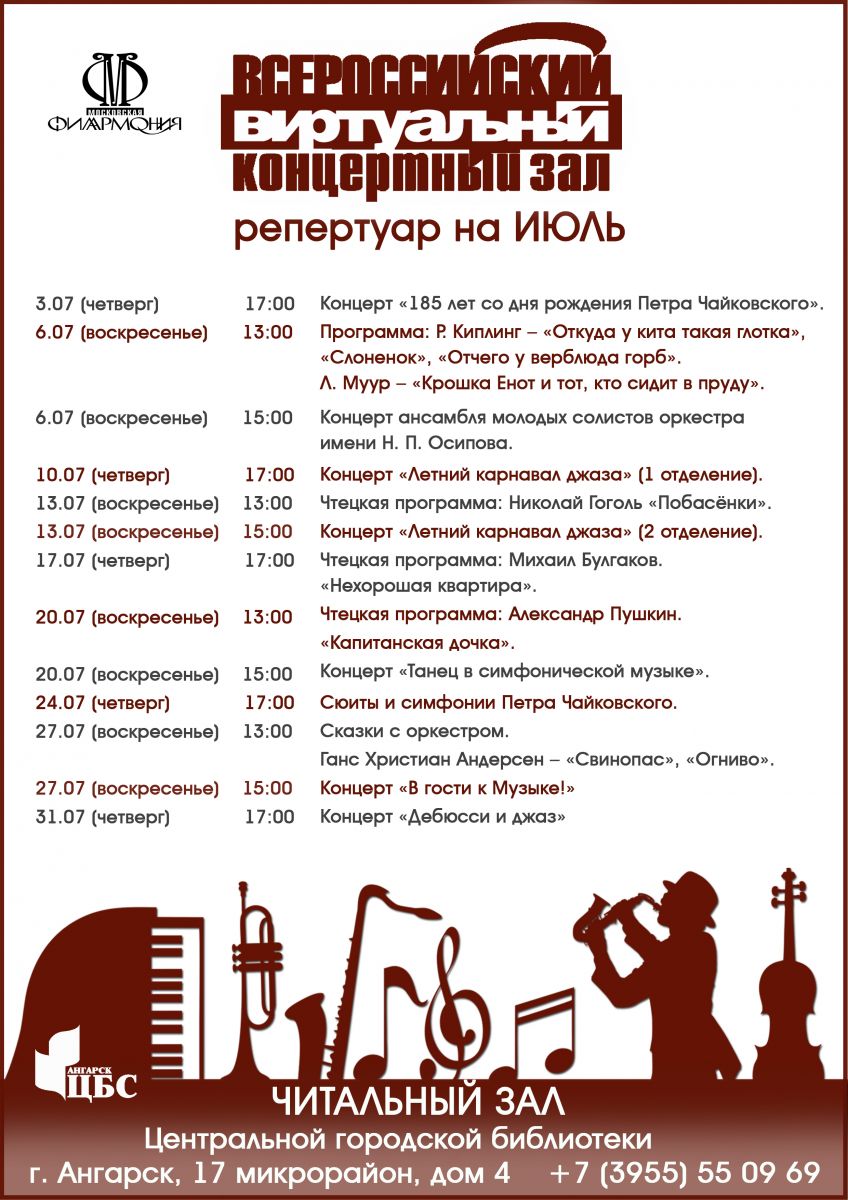 Виртуальный концертный зал. Репертуар на ИЮЛЬ Ждем вас в июле (четверг, воскресенье) по адресу: г. Ангарск, 17 микрорайон, дом 4, читальный зал Центральной городской библиотеки.