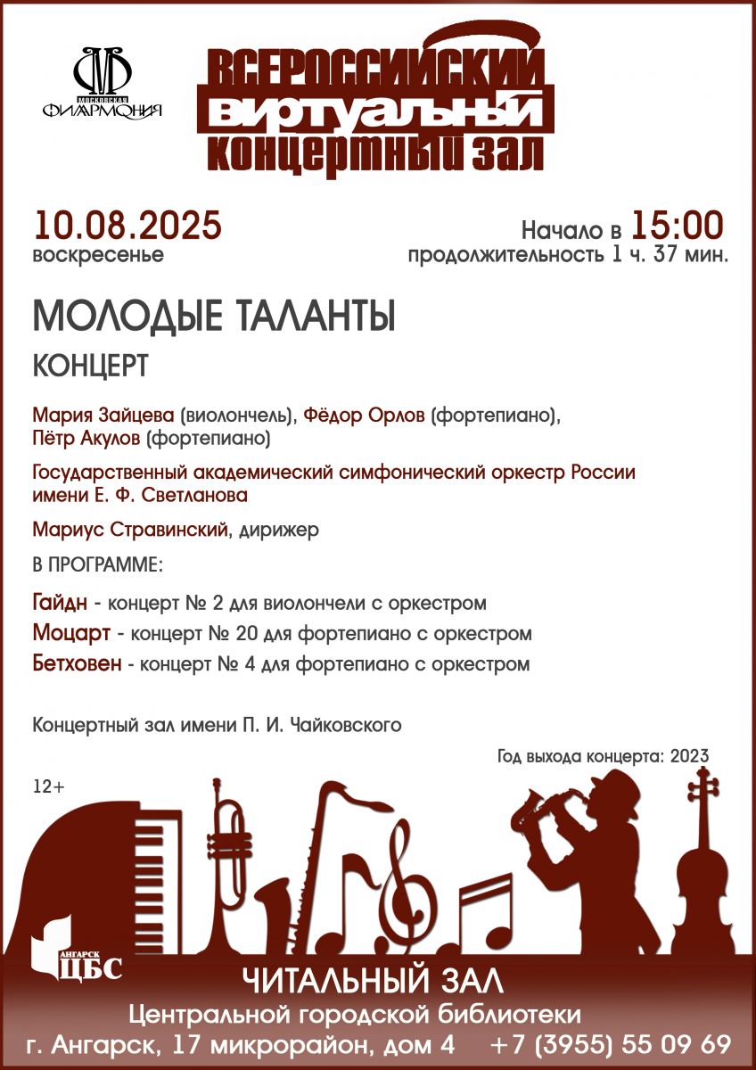 Начинающие звезды в сопровождении музыкантов Государственного академического симфонического оркестра России имени Е. Ф. Светланова под управлением дирижера Мариуса Стравинского исполнят Концерт № 2 для виолончели с оркестром Йозефа Гайдна, Концерт № 20 для фортепиано с оркестром Амадея Вольфганга Моцарта и Концерт № 4 для фортепиано с оркестром Людвига ван Бетховена.