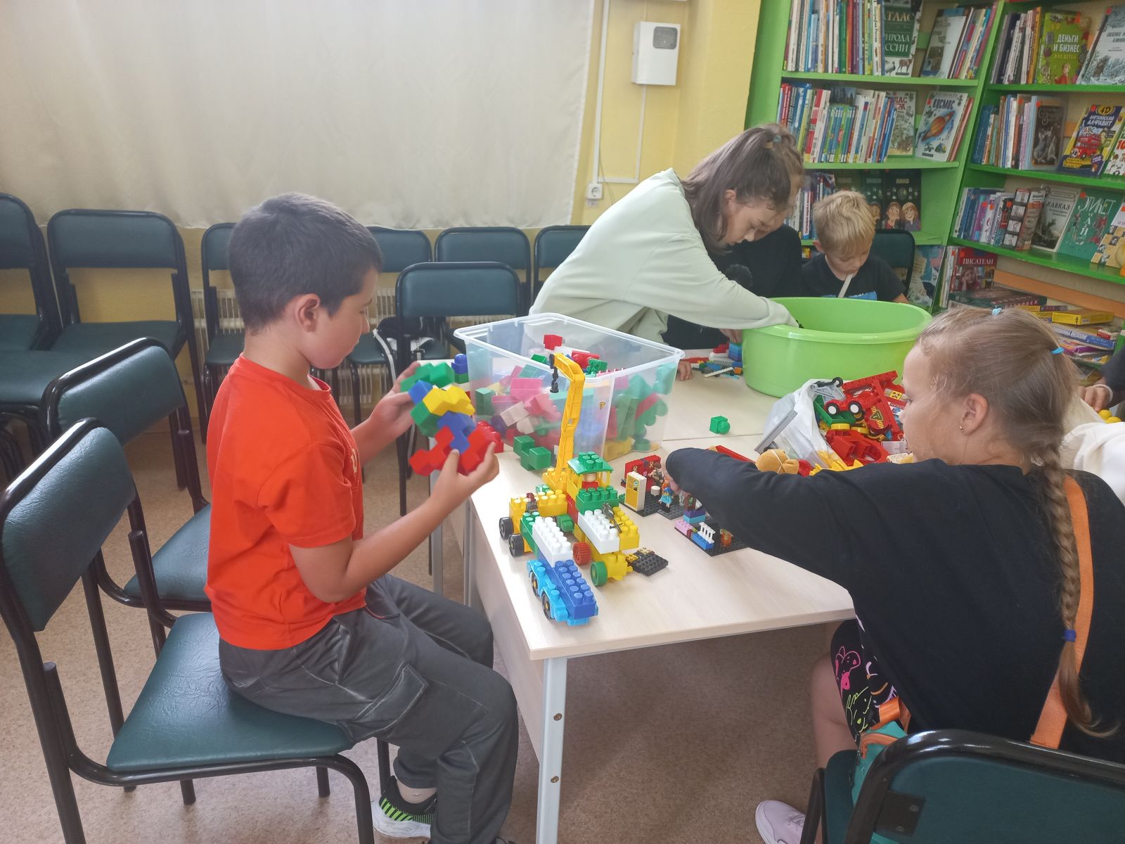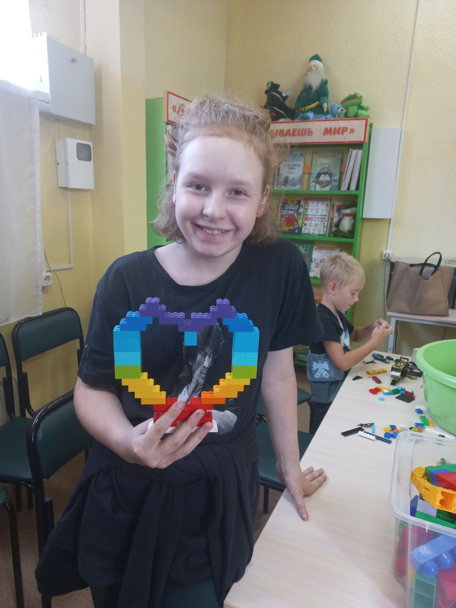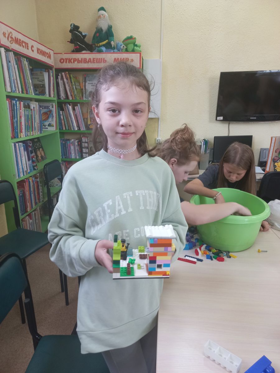 И каждый взялся за дело – фантазии детей не было предела! Участники, устроившись в уютном зале библиотеки, творили чудеса из россыпи ярких деталей любимого конструктора! Мальчики конструировали цветы и узоры необычайной красоты. Девочки собирали из кубиков военную базу, корабли, парк аттракционов.