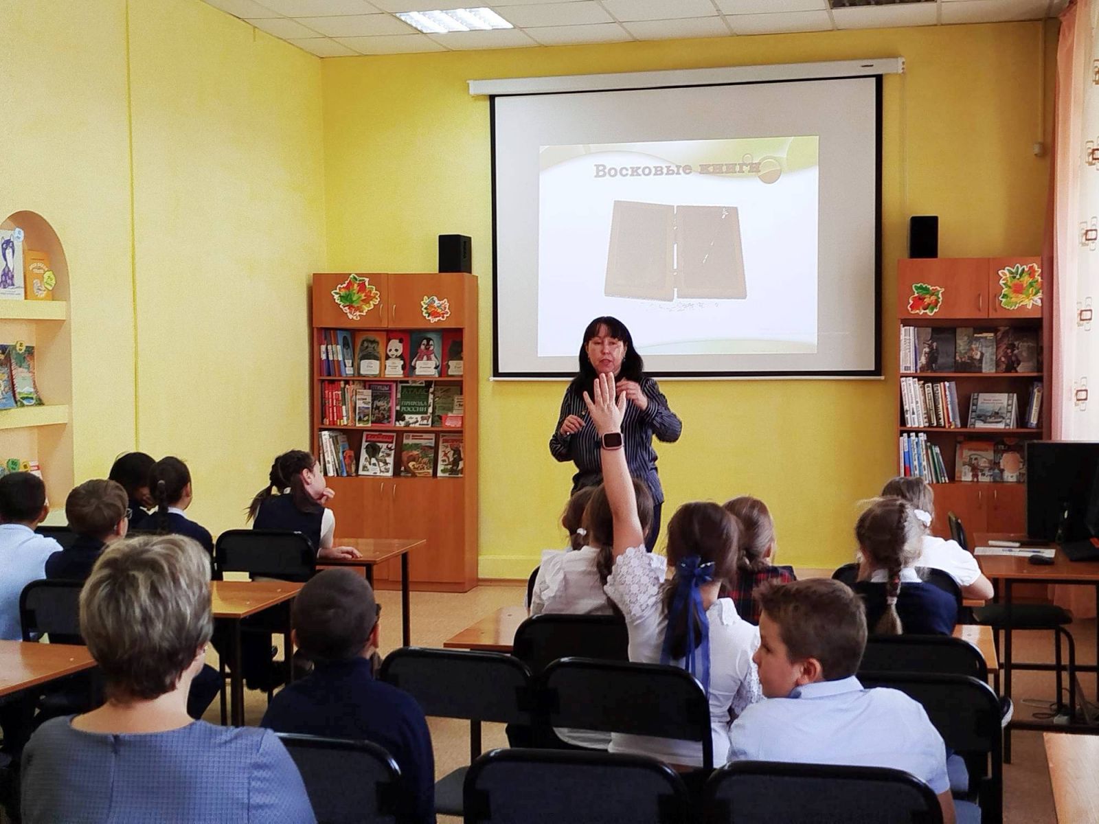 Младшие школьники узнали, что до появления книги существовало узелковое письмо, которое сменила пиктография. Для ребят стало открытием, что первым примером рисунчатого письма учёные считают наскальные рисунки, которые оставили на стенах своих пещер первобытные люди. Пергаментные книги славились своей отделкой и были очень тяжёлыми, так как изготавливались из кожи животных. Книги из папируса были хрупкими и хранились в виде свитков, а всем нам знакомую бумагу изобрёл китаец Цай Лунь.