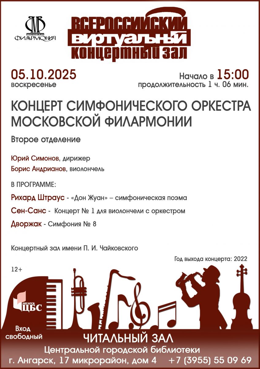 В программе концерта Академического симфонического оркестра Московской филармонии – замечательные музыкальные произведения. Посетители виртуального концертного зала Центральной городской библиотеки Ангарска услышат симфонию № 8 чешского композитора Антонина Дворжака, написанную в 1889 году по случаю его избрания в Чешскую академию наук, литературы и искусств.
