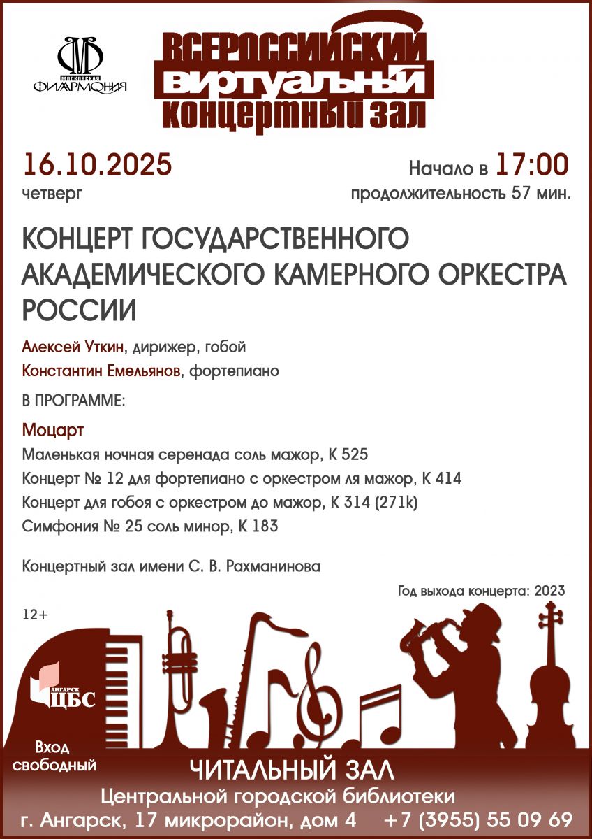 В исполнении Государственного академического камерного оркестра России прозвучат произведения великого австрийского композитора Вольфганга Амадея Моцарта. В программе – «Маленькая ночная серенада», Концерт № 12 для фортепиано с оркестром, Концерт для гобоя с оркестром, Симфония № 25.