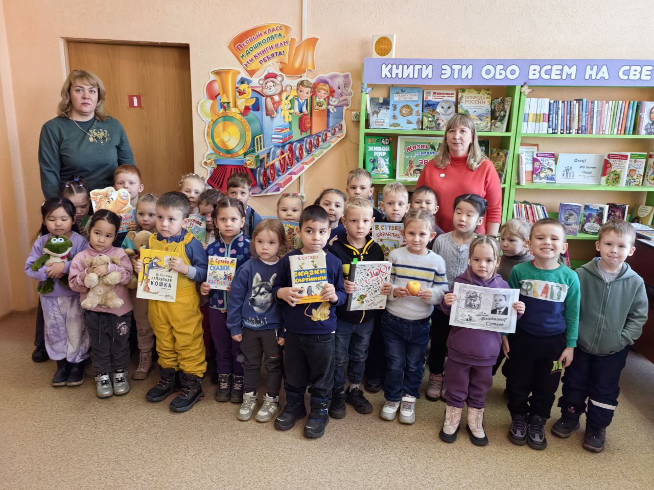23 октября в детской библиотеке № 8 было шумно и весело: к нам в гости пришли самые юные читатели – воспитанники детского сада № 74, – чтобы окунуться в волшебный мир сказок Владимира Григорьевича Сутеева.
