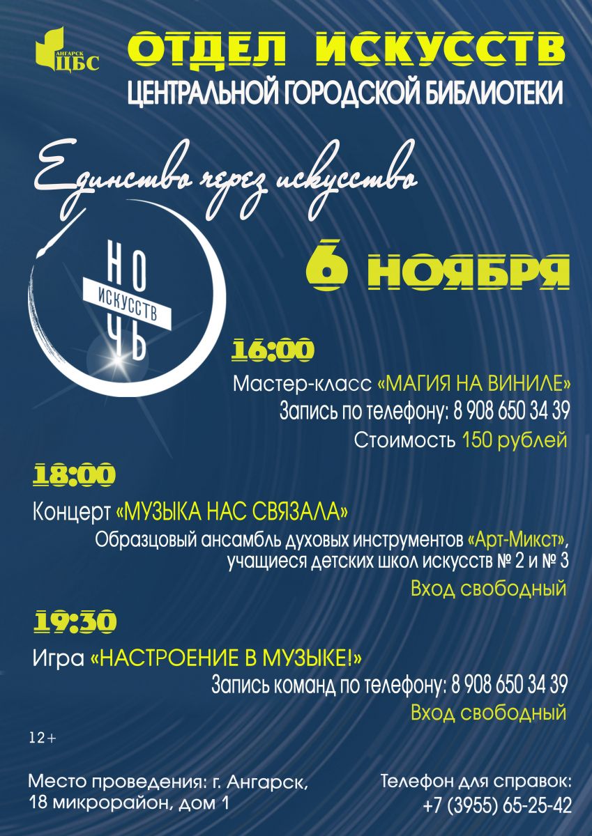 «Ночь искусств» – ежегодная всероссийская акция, которая проводится в первые дни последнего осеннего месяца. В отделе искусств Центральной городской библиотеки она состоится 6 ноября. Главной участницей акции этого года будет музыка, пройдет она под общим названием «Музыка нас связала».