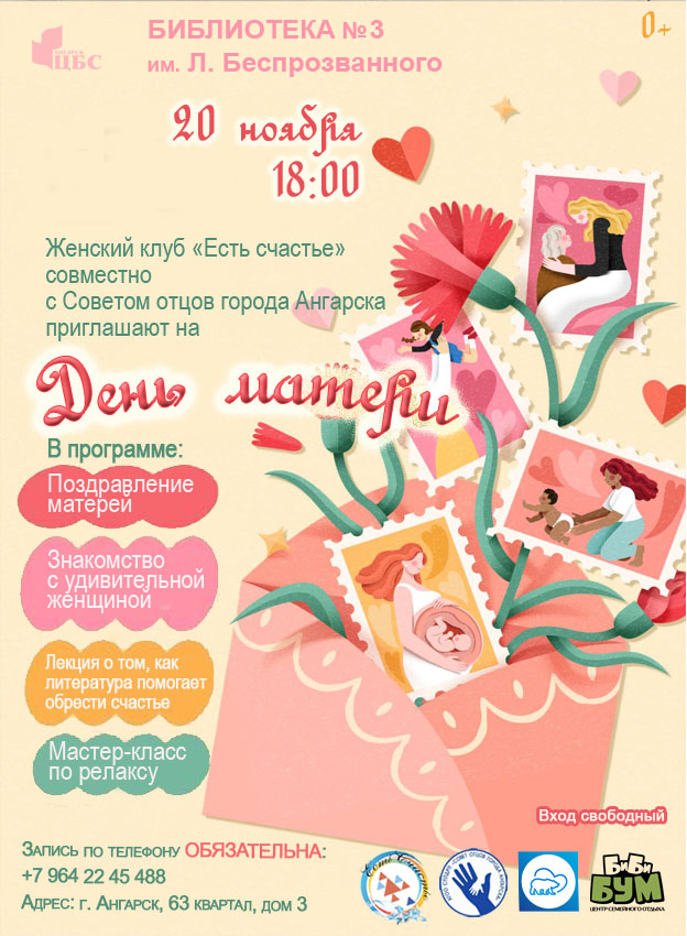 Уважаемые жители Ангарска! В преддверии Дня матери Женский клуб «Есть счастье» совместно с Советом отцов города Ангарска приглашают вас на мероприятие, которое состоится 20 ноября, в 18:00, в библиотеке №3 им. Л. Беспрозванного.