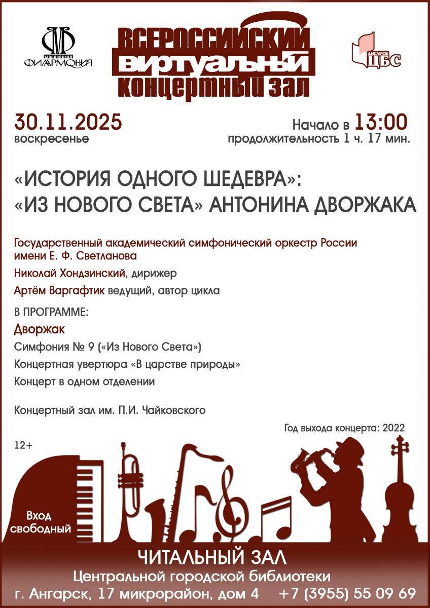 В программе – симфония № 9 «Из Нового Света», последняя симфония композитора, и концертная увертюра «В царстве природы». Музыкальные произведения прозвучат в исполнении Государственного академического симфонического оркестра России имени Е. Ф. Светланова под управлением дирижера Николая Хондзинского. Ведущий – Артем Варгафтик.