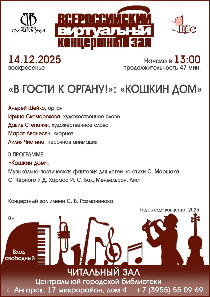 Виртуальный концертный зал ангарской библиотеки ждет своих юных посетителей, а также их родителей, бабушек и дедушек. В программе музыкально-поэтической фантазии для детей «Кошкин дом» из цикла «В гости к органу!» – стихи Самуила Маршака, Саши Черного, Даниила Хармса, музыкальные композиции Иоганна Себастьяна Баха, Феликса Мендельсона, Ференца Листа.