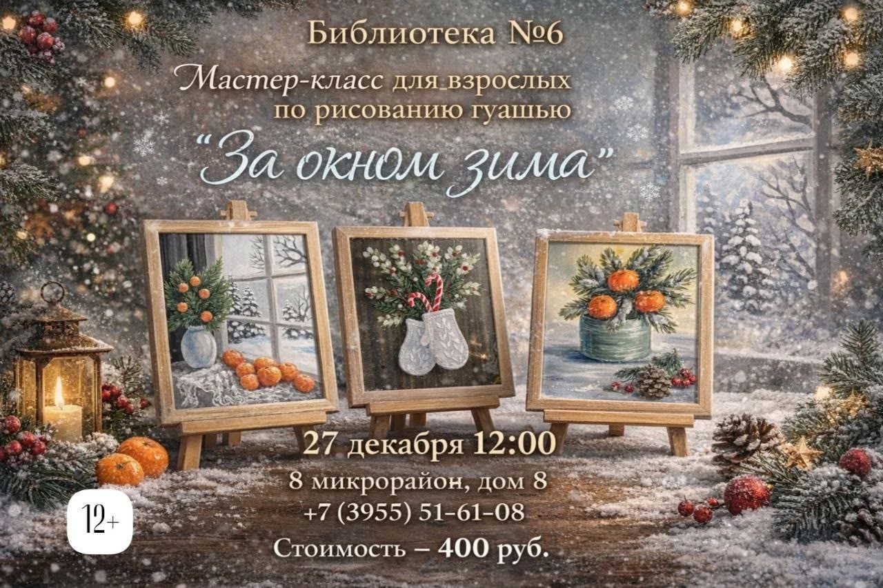 - 12:00 — мастер-класс для взрослых по рисованию гуашью «За окном зима». Стоимость — 400 рублей. 12+