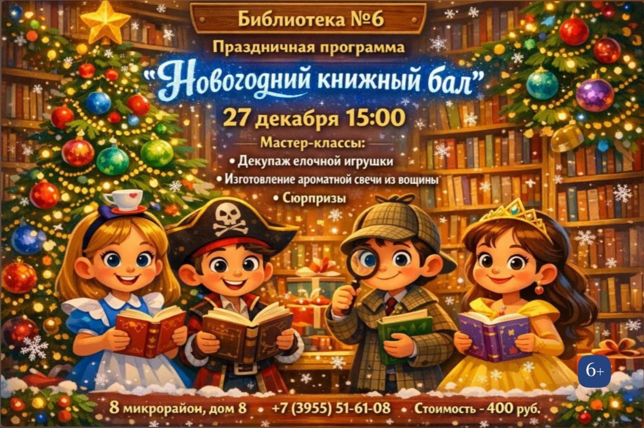 - 15:00 — праздничная программа «Новогодний книжный бал». Вас ждут мастер-классы: декупаж ёлочной игрушки, изготовление ароматной свечи из вощины. Стоимость – 400 руб. 6+