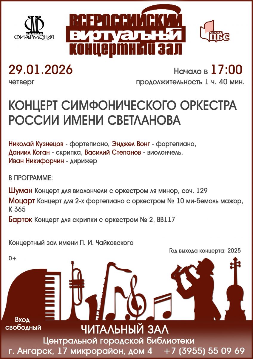 В концерте Государственного академического симфонического оркестра России имени Е. Ф. Светланова прозвучат сочинения зарубежных композиторов: Концерт для виолончели с оркестром ля минор Роберта Шумана, Концерт для двух фортепиано с оркестром № 10 ми-бемоль мажор Вольфганга Амадея Моцарта, Концерт для скрипки с оркестром № 2 Белы Бартока.